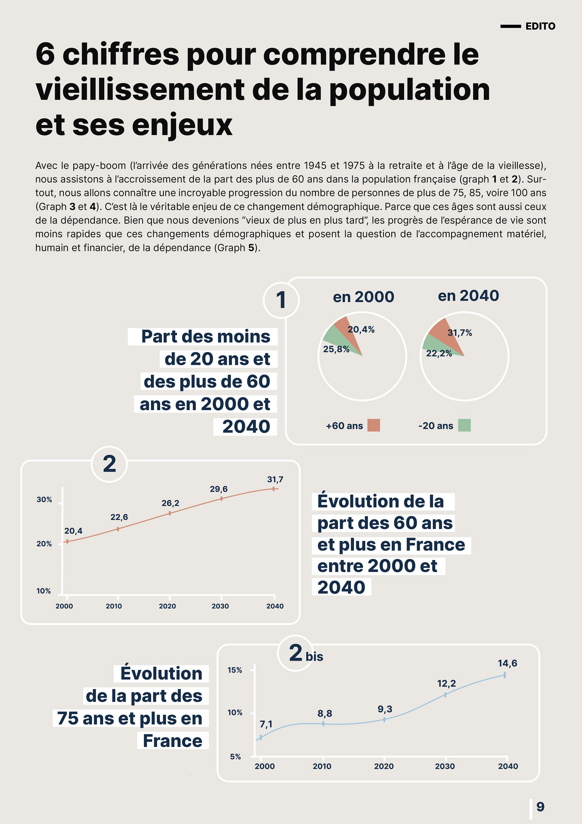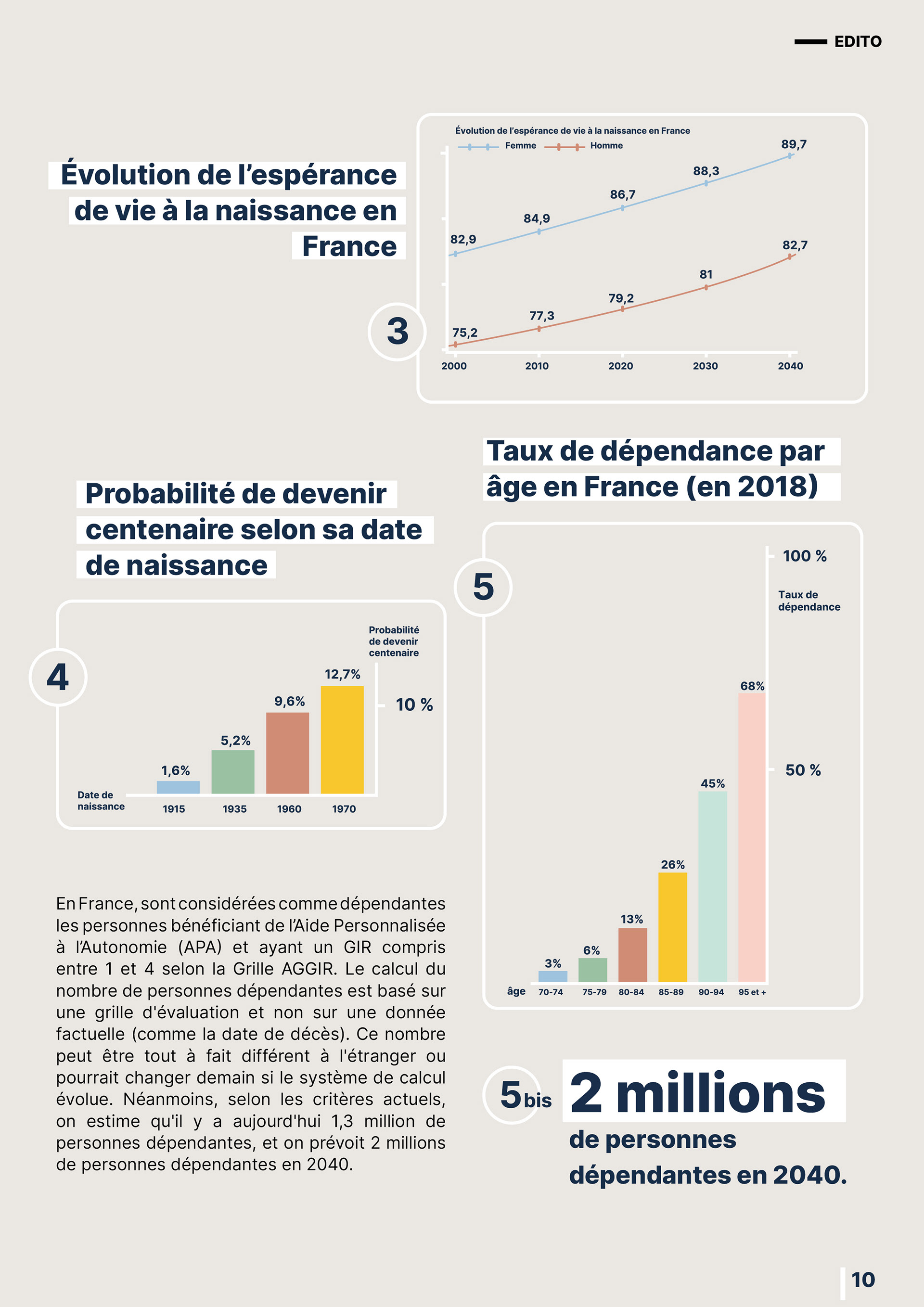 Pour l’incubateur de startups Paris & Co, j’ai réalisé la création graphique et la mise en page d’un document de 70 pages intitulé “Mieux vieillir demain”. Ce cahier de tendances avait pour vocation de regrouper un ensemble d’enquêtes et de contributions d’intervenants variés – startups, grandes entreprises et chercheurs spécialisés – autour des enjeux du vieillissement et de l’innovation, permettant aux lecteurs de mieux comprendre les tendances émergentes dans ce domaine. Mon travail de création graphique a contribué à valoriser ces contenus par une mise en page soignée et des illustrations percutantes.